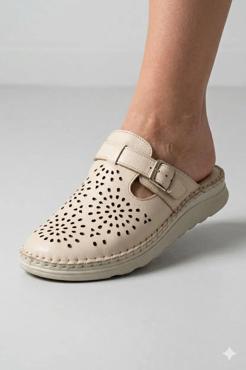 | Etiketler | Kadın Krem Deri Lazer Kesim Delikli Tokalı Comfort Sabo Terlik |